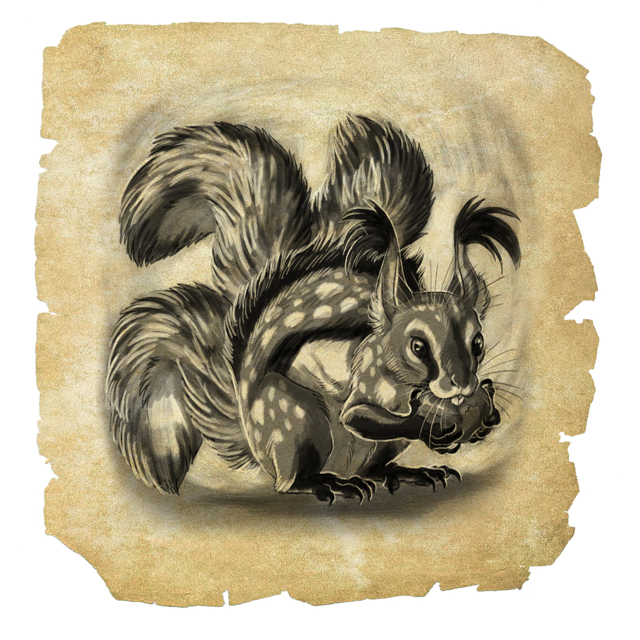 Attributes: Small rodent with a triplet of bushy tails, fur-ridge along the spine, hairy ears, and a penchant for mischief
